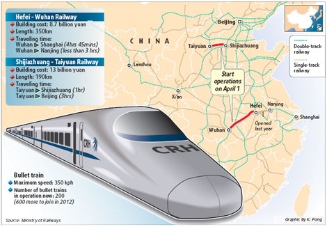 "Riding a bullet train at 250 kph from Wuhan to Nanjing will need less than three hours, almost eight hours less than now," said Zhang Shuguang, chief of the transportation department of the Ministry of Railways.